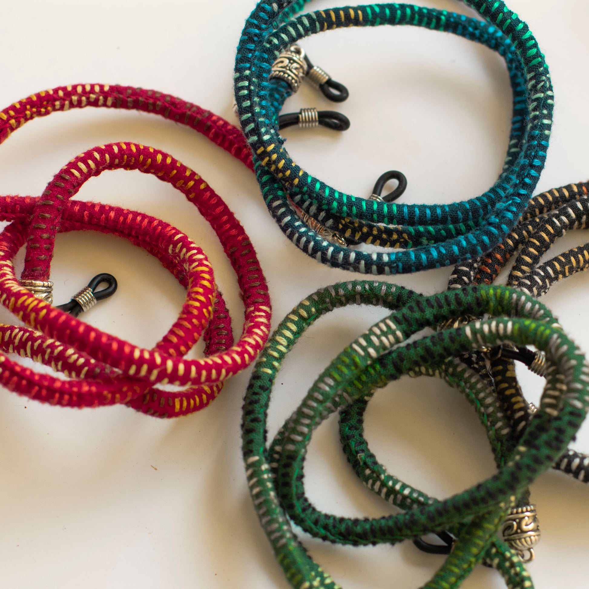 Multi-colour cotton rope glasses holder with attachment with white metal attachment and plastic adjuster.